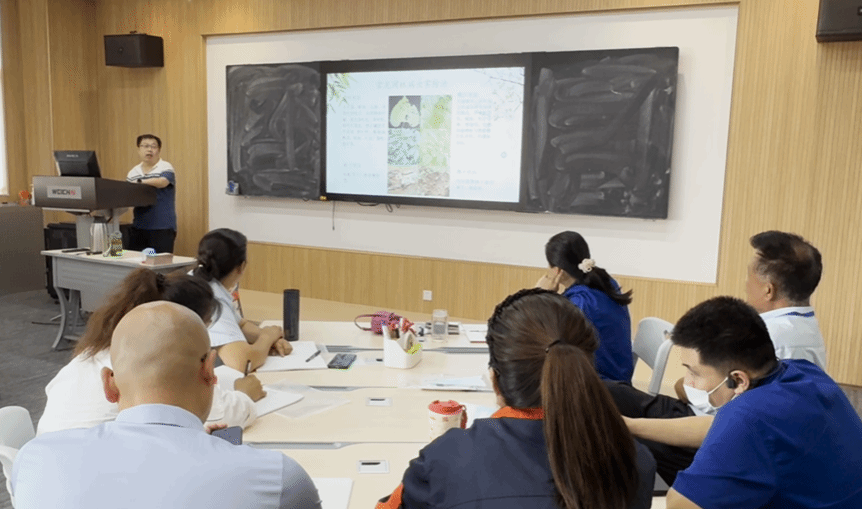 培训第一部分,李重阳老师围绕“园林植物病虫害综合防治技术”进行了系统讲解。他结合潍柴集团厂区及生活区的实际绿化环境,深入浅出地介绍了北方地区常见园林病虫害的识别特征、发生规律及绿色防控策略。李老师重点强调了科学用药、生物防治与生态调控相结合的综合治理理念,并通过大量实物图片和典型案例分析,使枯燥的理论知识变得生动直观,学员们听得津津有味,不时记录要点。