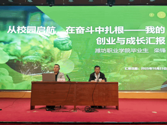汇报中,栾锋先分享了自己的成长历程,两次创业失败的经历让他学会敬畏行业、复盘反思与果断止损,最终选择回归家乡安丘,锚定乡村振兴赛道,打造多个农业项目并创业成功。随后他结合自身发展寄语学弟学妹:专业是多元发展的“敲门砖”,需深耕所学厚积薄发;失败是宝贵的“经验课”,要勇敢试错、正视成长。他特别强调,“眼里要有光,保持对未来的热忱;心里要有根,坚守专业与乡土情怀”,这正是他穿越创业风浪的核心密码。